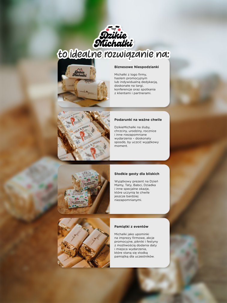 DzikieMichałki to staranne połączenie aksamitnej czekolady, oraz chrupiących orzechów arachidowych, które w zestawieniu z dzikim, spersonalizowanym nadrukiem stają się niespotykanym upominkiem. W odróżnieniu od tradycyjnych słodyczy, DzikieMichałki oferują aż cztery ściany powierzchni projektowej, co pozwala nam na stworzenie niezwykle bogatej i czytelnej grafiki. To produkt dla osób szukających czegoś więcej niż zwykły cukierek – to klasyka polskiego cukiernictwa w nowoczesnym, spersonalizowanym wydaniu.